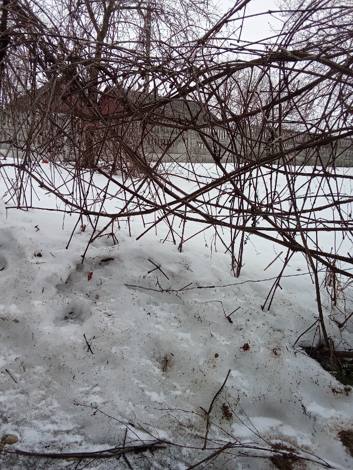 The scene depicts an outdoor winter or early spring environment in Yarun, Ukraine. The foreground is dominated by a mound of melting, dirty snow containing embedded twigs, leaf debris, and visible patches of dark soil. A dense, tangled network of bare, dark-brown branches, likely from a deciduous shrub or vine, extends across the entire frame, obscuring much of the background. Some of these branches are partially covered by snow. Beyond the foreground, a flatter expanse of snow-covered ground is visible. In the background, partially obscured by the branches, a residential area is present. A building with a reddish roof is discernible on the left, surrounded by bare trees. A lighter-colored structure or fence line runs horizontally across the mid-to-background, and a fence, possibly concrete or gray-painted wood, is visible further back. The sky is overcast and uniformly light gray. No individuals or overt actions are present.