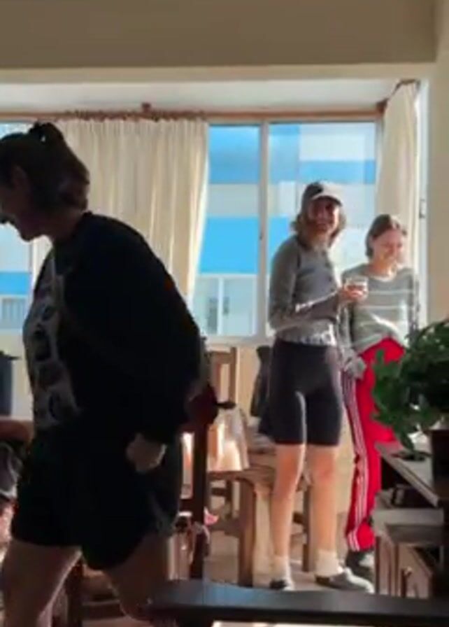 Three women are standing near a window. The woman closest to the camera is wearing a black long sleeve shirt, black shorts, and has a cross body bag. She is standing by a dining room table and chairs and has dark hair pulled back. To the right of her, another woman is holding a clear glass, wearing a gray long sleeve shirt, black shorts, and a baseball cap. To the right of the woman in the cap, another woman is wearing a gray striped long sleeve shirt and red athletic pants with white stripes down the sides. The window is behind them and it has white curtains and views of another building.