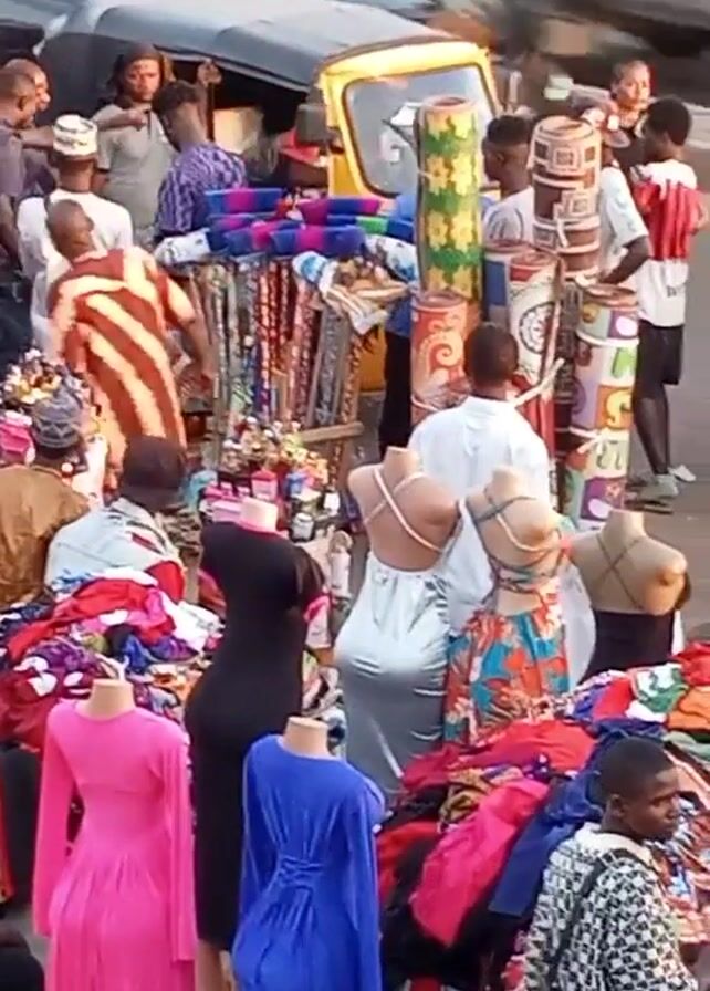 busy outdoor market scene. There are numerous people milling around. A yellow auto rickshaw, sometimes referred to as a tuk-tuk, is partially visible near the center of the frame. Multiple mannequins wearing dresses are set up in the foreground amidst a pile of clothing. Behind the mannequins, there are stalls displaying various goods, including carpets and fabrics. People are gathered around these stalls, presumably browsing or making purchases. Cars and motorcycles drive by on a nearby road. The overall impression is that of a bustling and crowded marketplace.