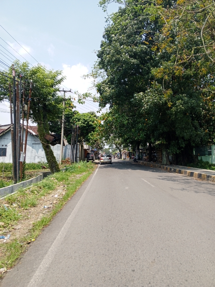 This image depicts a street scene in Multhan, India, under clear daylight conditions. A two-lane asphalt road extends into the distance, marked by a white dashed centerline. On the left, a concrete drainage ditch runs parallel to the road, bordered by an unkempt strip of grass and dirt. Beyond this strip, multiple utility poles with a dense network of overhead wires are visible. Behind the poles and wires, a single-story, light-colored residential structure with a red-brown tiled roof and a rectangular window is partially visible, followed by a corrugated metal fence. Further down the road on the left, several dark-colored vehicles are parked parallel to the street. On the right side of the road, a raised curb with alternating yellow and black paint markings separates the asphalt from a tree-lined area. Large, dense green trees with heavy foliage line both sides of the road, forming a partial canopy overhead further down the street. In the midground, a light-colored sedan or hatchback is visible, facing away from the camera, on the right side of the road, possibly in motion or parked. The sky above is light blue with scattered white clouds. No discernible individuals are present in the immediate foreground or midground.