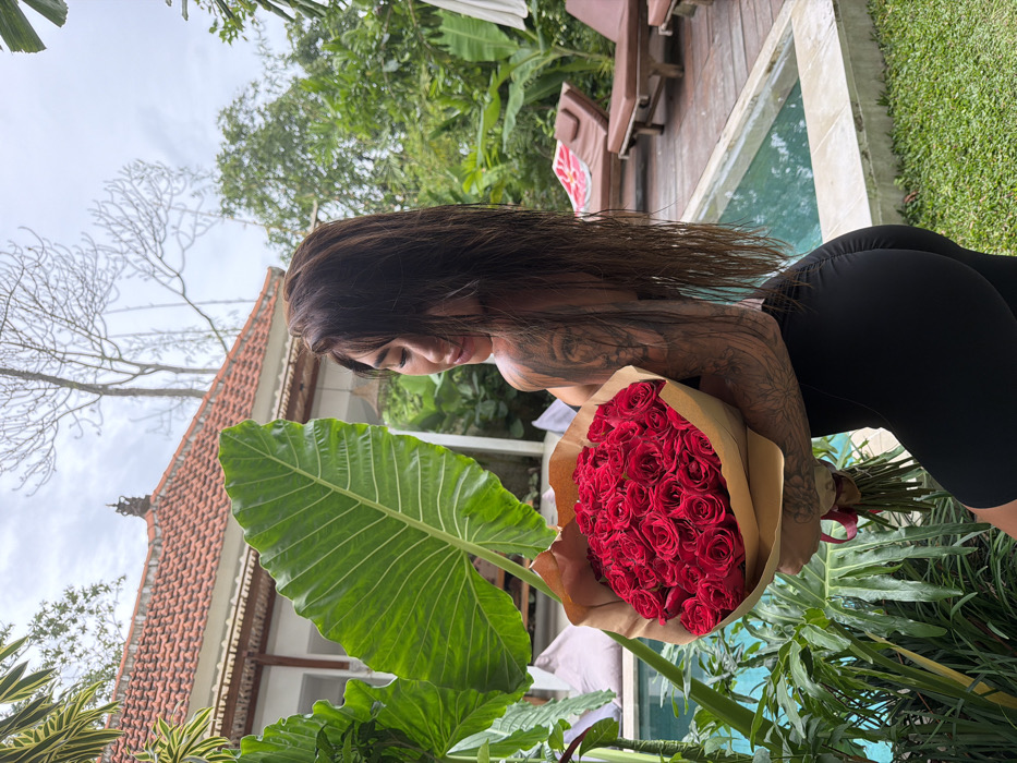 A woman with dark hair and tattoos on her arms holds a bouquet of red roses wrapped in brown paper. She is wearing black athletic wear. The setting appears to be outdoors with a building with a tiled roof in the background, lush greenery, and what looks like a pool. The photo seems to be taken from a slightly low angle, tilted to the side.