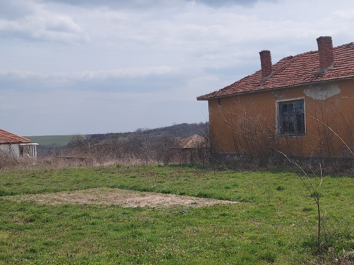 The image depicts a rural or semi-rural landscape in Drianovo, Bulgaria, under an overcast sky. In the foreground and mid-ground is an unkempt grassy field showing variations in vegetation density, with some patches of sparser or dry grass. On the right side of the frame, a single-story residential structure with ochre-colored stucco walls is visible. This building has a red tile roof featuring two prominent brick chimneys. The walls show signs of degradation, including peeling paint and exposed plaster, particularly beneath the roofline. A single window, dark and appearing either boarded or with obscured panes, is centered on the visible facade. Barren, twiggy bushes are situated directly in front of this house. On the far left of the frame, another partial structure, white in color with a red tile roof and what appears to be a porch or balcony with white columns, is visible. The background consists of rolling terrain covered by a mix of leafless deciduous trees and green agricultural fields under a hazy sky. No individuals or active subjects are present.