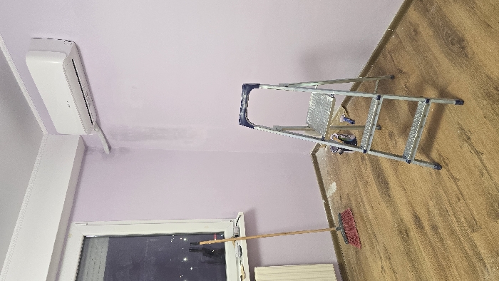 The image displays an interior room in Pleven, Bulgaria, appearing to be in the process of renovation or redecoration. The walls are painted a light lavender or pale purple, extending to a white ceiling featuring decorative molding. A white split-system air conditioning unit is mounted horizontally on the upper right wall. A large white-framed window occupies the left side, revealing a dark exterior with scattered distant lights, suggesting nighttime. Below the window, a white radiator is installed. The floor is covered with light brown laminate planks, showing dust, debris, and some white splatters, indicative of ongoing work. A three-step, metallic silver ladder with dark blue plastic accents is positioned in the mid-right foreground. Two blue-handled paint rollers rest horizontally on the top step of the ladder. Leaning against the wall beneath the window is a broom with a wooden handle and a red bristled head. Small, indistinct items are present on the white window sill. No people are visible.