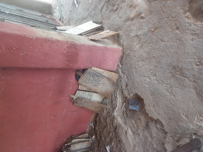The scene depicts an interior or sheltered outdoor corner, characterized by an uneven, dry, light brown compacted earth floor. A dark, slender cylindrical object protrudes from the ground in the lower-left foreground, and a small, dark, irregular object is partially embedded in the earth near the center. The prominent left wall is painted a faded reddish-brown or terracotta, exhibiting discoloration and numerous small white marks. Against the base of this wall, a collection of light-colored, rectangular wooden boards is stacked, some featuring top protrusions. A concrete pillar, also painted reddish-brown, forms a corner on the right. Leaning against this pillar and the adjacent wall is a cluster of similar light-brown wooden boards, several of which display distinct black handwritten script in an Arabic-like calligraphy. Beyond the pillar to the far right, an opening reveals a brighter outdoor area with a corrugated metal structure, likely a fence or gate. No individuals are present, and no actions or interactions are depicted. The location is in the city of Unknown, Unknown.