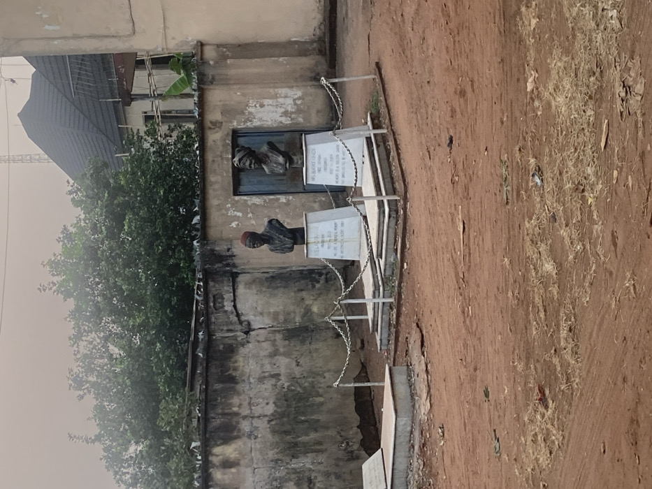 Two portrait busts are affixed to a weathered wall, each accompanied by a small, white plaque. The busts are enclosed by a low, silver-colored chain fence. The surrounding ground is dirt. Green foliage is present to the left of the wall, and a partial view of a building roof is visible in the upper left corner. The wall appears aged, with signs of discoloration and cracking.