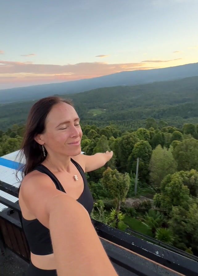 A person is taking a selfie from a balcony at sunset. The person is a light-skinned woman with long brown hair wearing a black athletic top and leggings. She smiles, raises an arm in the air, and turns the camera to reveal a view of mountains and a forest. The landscape is bathed in the golden light of the setting sun. In the foreground is a balcony with a dark railing. A white roof of a nearby building is also visible. The sky is a gradient of blue and orange with a few scattered clouds.