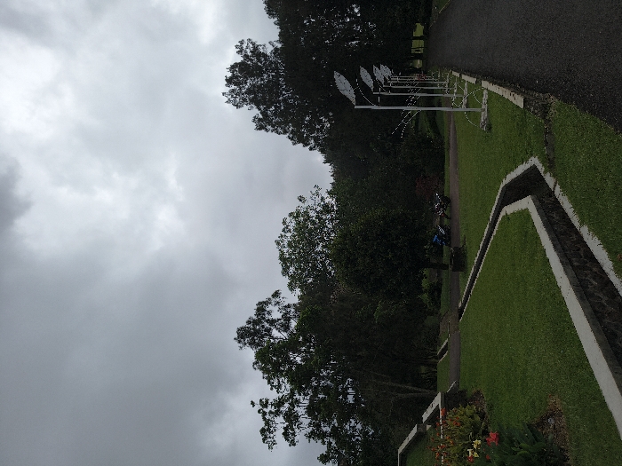A gray sky hangs over a landscape with trees, a grassy area, and a concrete ditch. A paved road runs along the right side of the frame. Several white poles with horizontal bars stand in a row. Two motorbikes are parked next to the trees. The scene is overcast and appears to be in a park or garden setting.