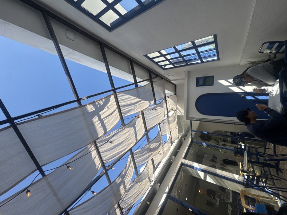 The image displays an outdoor dining area beneath a shaded structure. White fabric sails hang from a metal frame, offering protection from the sun, with glimpses of a bright blue sky visible. String lights are woven among the sails. The dining area has blue accents, including a door and window frames. People are seated at tables, engaging with their phones. The space features large windows that offer views of the interior.
