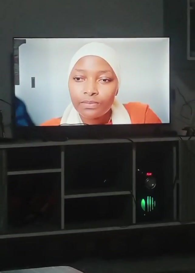 television screen displaying two people, alternating between them in quick succession. The first person is a woman with dark skin, wearing a white headscarf and an orange top. The second person is a man with dark skin, a trimmed beard, and a blue shirt. The television is placed on a grey and white entertainment center. To the right of the television, on the bottom shelf of the entertainment center, is a computer tower with green lights visible on the front panel. A small portion of a grey table is visible in the foreground. The environment appears to be a dimly lit room.
