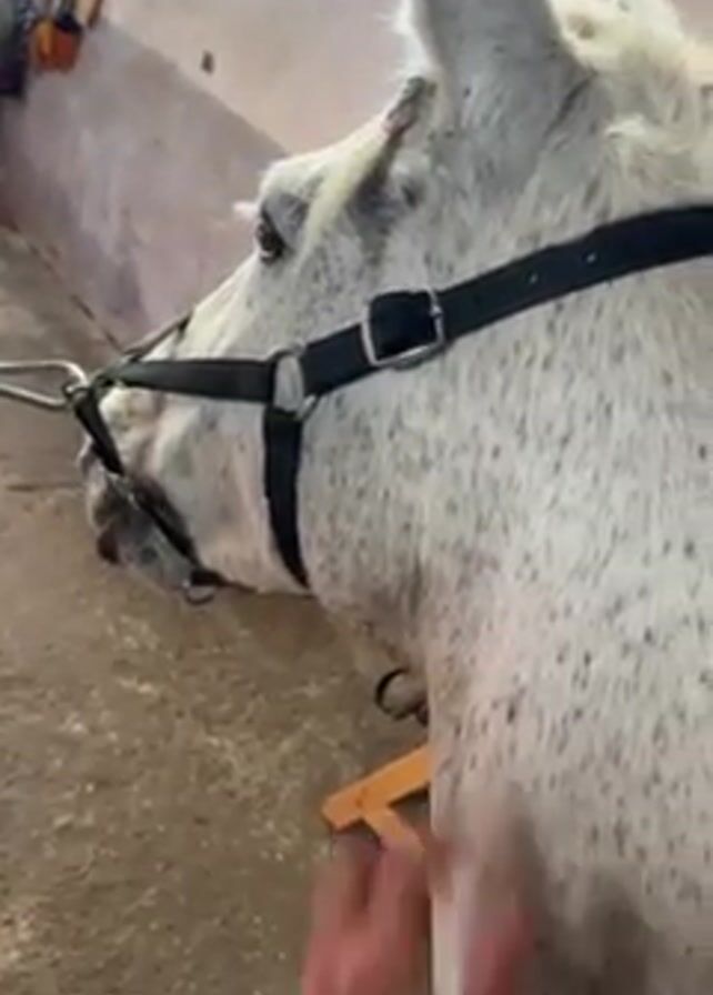person petting a dappled gray horse. The horse is wearing a black halter and is standing in what appears to be a barn or stable. The person's hand, wearing a watch with a green band, is seen stroking the horse's neck and shoulder. A window is visible in the background, and other equestrian equipment can be seen hanging on the wall. A small wooden stand is also visible next to the horse.