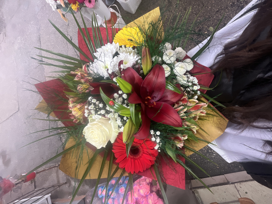 - "A large, vibrant floral bouquet is prominently displayed, held by an individual whose dark brown hair and a portion of a white garment are visible at the bottom of the frame" by FM-JSWnl2, licensed under CC BY 4.0