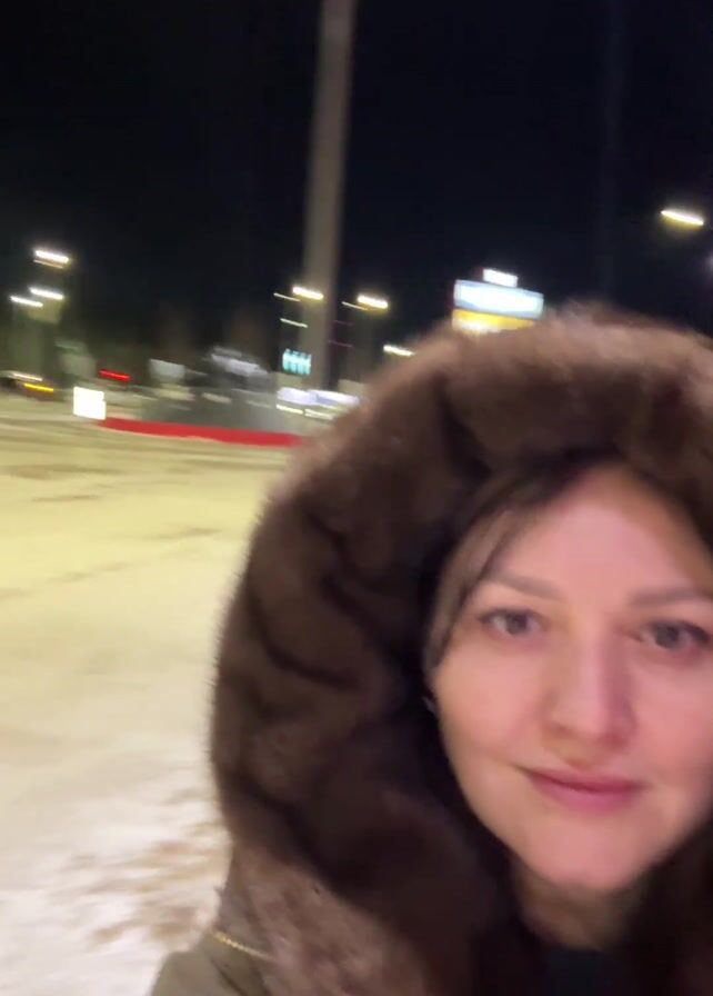 A woman wearing a brown fur-lined hood is walking outside at night. There is snow on the ground and streetlights illuminate the scene. The background includes cars and buildings. The woman appears to be looking directly at the camera. The video is a close-up shot.