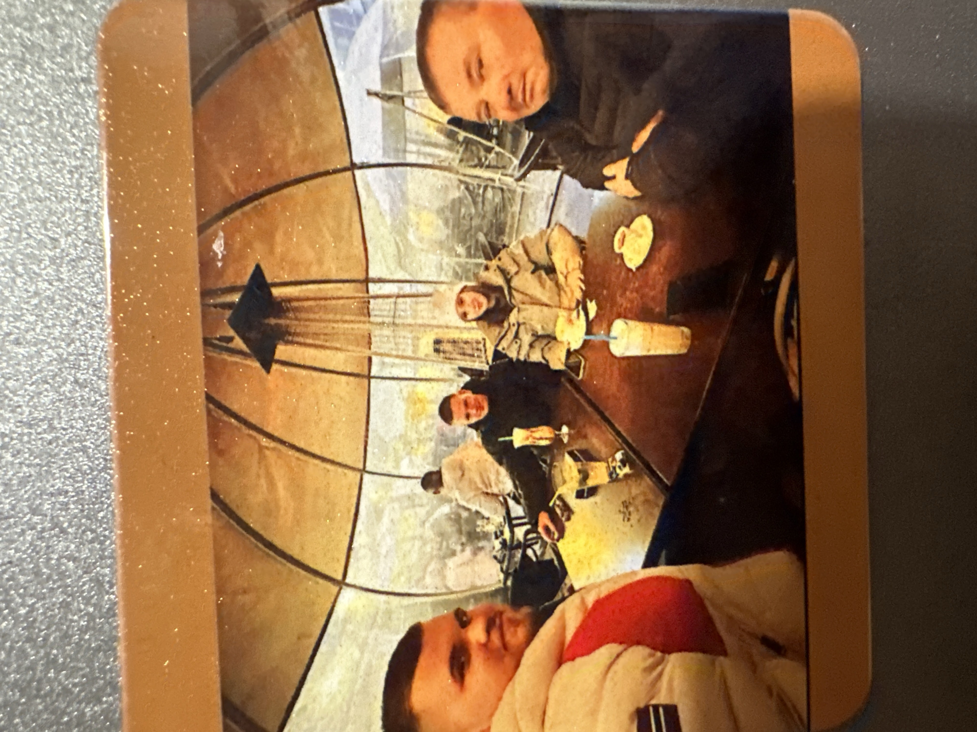 The image, appearing to be a photograph of a textured print or coaster with glittery top and bottom borders, captures four individuals and a partially visible fifth person seated within a transparent, dome-shaped outdoor dining pod at a cafe in Sofia, Bulgaria