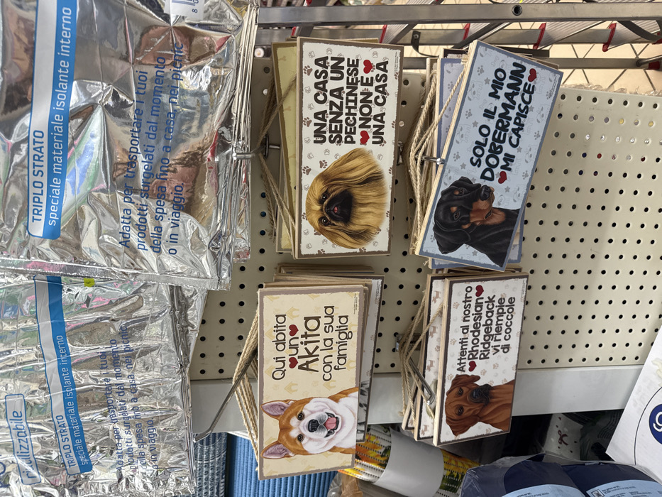 This image depicts a retail display in a store located in Anzio, Italy. The primary subjects are four rectangular wooden signs, approximately 10x15 cm each, designed to hang by a twine loop. Each sign features an illustrated dog breed on the left side and Italian text on the right. * The top-left sign displays an Akita and reads: "Qui abita un Akita con la sua famiglia" (Here lives an Akita with its family). * The top-right sign features a Pekingese and states: "Una casa senza un Pechinese non è una casa" (A house without a Pekingese is not a house). * The bottom-left sign shows a Rhodesian Ridgeback and says: "Attenti al nostro Rhodesian Ridgeback vi riempie di coccole" (Beware of our Rhodesian Ridgeback, it will fill you with cuddles). * The bottom-right sign presents a Dobermann and reads: "Solo il mio Dobermann mi capisce" (Only my Dobermann understands me). Above these signs, two silver, crinkled foil packages are visible, labeled "TRIPLO STRATO speciale materiale isolante interno" (TRIPLE LAYER special insulating material internal). The text further describes their use: "Adatta per trasportare i tuoi prodotti surgelati dal momento della spesa fino a casa, nei picnic o in viaggio" (Suitable for transporting your frozen products from the moment of purchase home, to picnics or when traveling). The items are displayed on a white, perforated pegboard backing. To the left, a blue ridged material and a roll of patterned fabric are partially visible. To the right, a section of a red and metal shelving unit is present. The lighting is uniform, suggesting an indoor retail environment. No individuals are present in the frame.