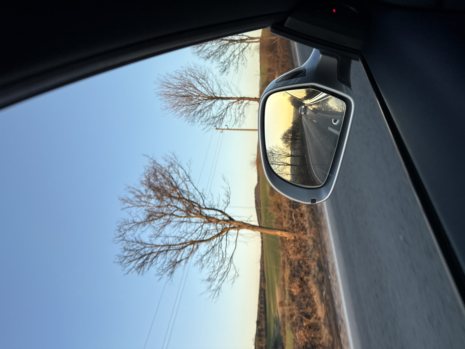 The image displays a view from inside a moving vehicle on a rural road near Kamburovo, Bulgaria, during the late afternoon. The vehicle's silver-grey side mirror is prominently positioned on the right, reflecting the road behind. Within the mirror's reflection, a two-lane asphalt road recedes into the distance, bordered by bare deciduous trees, with a white sedan observed far down the road against a yellowish-orange sky. Outside the vehicle, to the left of the mirror, the asphalt road is visible. The adjacent landscape includes bare deciduous trees, utility poles supporting power lines, and fields with green and brown vegetation, leading to distant hills under a clear blue sky that brightens to yellow at the horizon. A dark interior car door panel with a small red indicator light is visible in the lower right portion of the frame. No individuals are depicted.