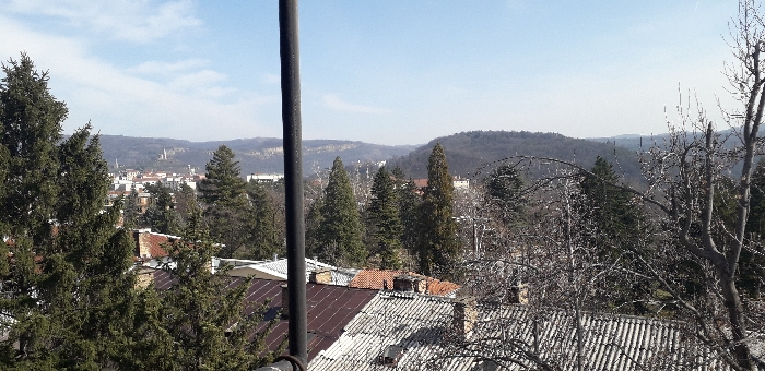 This image presents an elevated panoramic view of the city of Veliko Tarnovo, Bulgaria, combining urban elements with a natural hilly landscape under a clear sky. In the immediate foreground, a vertical black cylindrical object, possibly a utility pole or antenna, occupies the left side of the frame. Below and to the left, dense clusters of dark green coniferous trees are prominent, while to the right, several deciduous trees exhibit intricate, bare branches, indicating a dormant state. Portions of several building roofs are visible beneath the tree line, displaying both corrugated grey and reddish-orange terracotta tiling. The midground features a sprawling urban area composed of numerous light-colored buildings interspersed with various types of trees. A prominent landmark, the white Monument to the Assen Dynasty, is clearly discernible atop a distant, tree-covered hill towards the center-left. Additional hills, densely vegetated with trees, form a natural backdrop to the city. The background consists of further layers of tree-covered hills and mountains receding into the distance. The sky is predominantly clear and light blue, with minimal, wispy white cloud cover. No individuals or active interactions are observed within the scene. The environmental conditions suggest a daytime setting, likely during late winter or early spring given the mixture of verdant coniferous trees and bare deciduous trees.