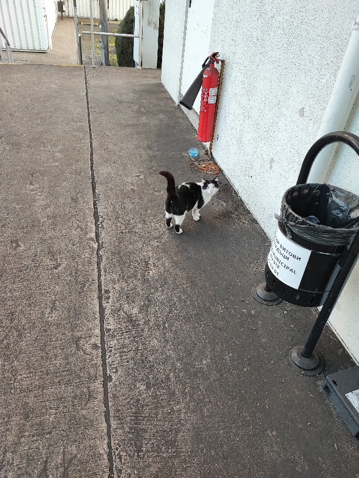 An outdoor concrete pathway, divided by a central seam, runs alongside a white, textured building wall in Obruchishte, Bulgaria. A black and white tuxedo cat stands in the mid-ground, facing towards the right with its tail raised. Near the cat and the wall, a red fire extinguisher is mounted. On the ground next to the wall, a clear plastic container holds a blue liquid, and scattered dry food is visible. Further right, a black public waste bin with a black plastic liner and a label including the text "MUNICIPAL WASTE" is affixed to a metal stand. In the background, the concrete pathway continues uphill, flanked by metal handrails and white structures, with some dark green foliage visible.