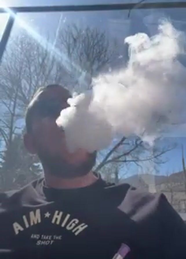 A man wearing sunglasses and a black sweatshirt with the words "AIM HIGH and take the shot" is blowing out a large puff of smoke. He is holding a vaping device with a purple tip. He is sitting in an area that appears to be outdoors, with a tree visible in the background. The sun is shining brightly, causing glare in the video.