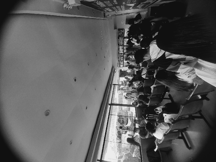 A black and white image displays a waiting area, likely an airport or similar transport hub. Rows of people are seated, facing a large window. Outside, hints of vehicles and activity can be seen. The interior space is simple, with a high ceiling dotted with recessed lights. Posters and signage are displayed along the upper wall. The image is rotated, placing the window and seating along the right side.