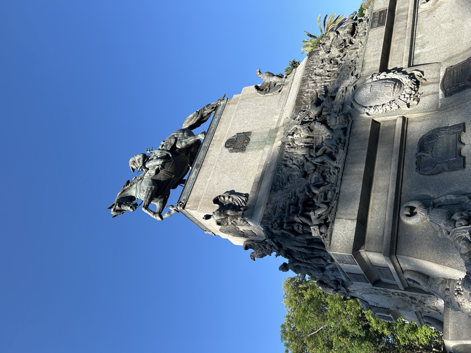 A statue of a man on horseback is set against a clear blue sky. The base of the monument features intricate carvings and details, with a multi-layered design. The statue and monument appear to be made of stone or bronze. Green trees and palm fronds are visible at the monument's base, suggesting an outdoor setting.