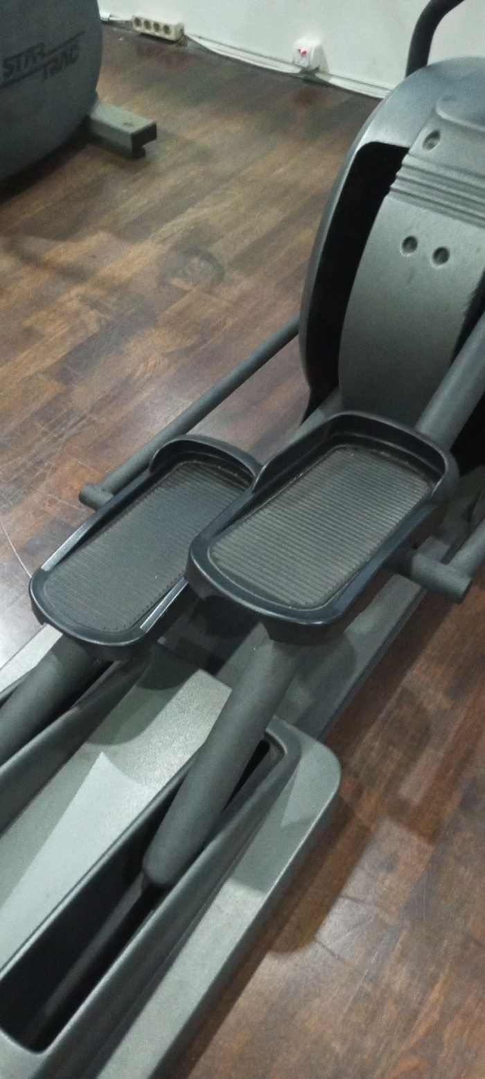 The scene is an interior view of a fitness facility located in Aral, Kyrgyzstan. A dark gray elliptical exercise machine occupies the foreground and midground, presenting its two ribbed, black foot pedals positioned over gray and black structural components. To the immediate left, a portion of a second gray exercise machine is visible, displaying a "STAR TRAC" logo on its side. The floor is composed of dark brown polished wood, exhibiting varied grain patterns and some surface wear. In the background, a plain, light-colored wall runs perpendicular to the floor. Along the base of this wall, a white four-outlet power strip and a single white electrical outlet are visible, accompanied by white cables extending horizontally. No individuals are present, and no specific actions or interactions are depicted within the frame.