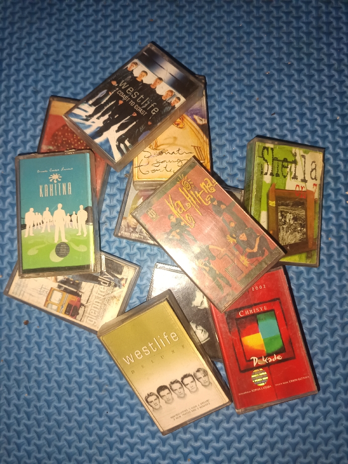 A collection of approximately twelve audio cassette tapes is scattered across a blue, textured surface, likely a mat or woven plastic floor, in Sirnagalih, Indonesia