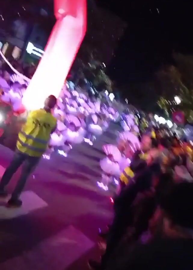 At night, a street parade moves forward amidst a crowd. A tall, red inflatable structure and a float featuring a person in a white gown and ornate headwear pass by. A man in a yellow safety vest stands to the side, seemingly monitoring the parade. Confetti is released, adding to the festive atmosphere. The scene is brightly lit with various colored lights highlighting the participants and decorations.