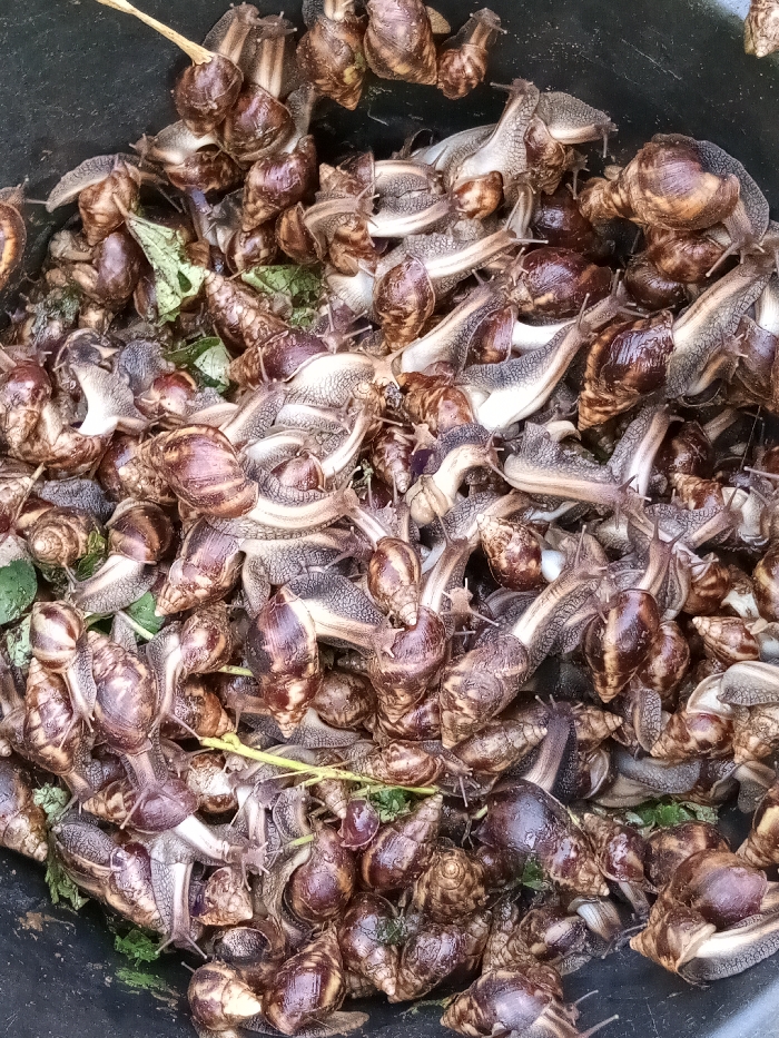- "The image displays a dense aggregation of numerous live Giant African Land Snails inside a dark-colored container, consistent with a bucket or bin, located in Ejule, Nigeria" by FM-GcXoD3, licensed under CC BY 4.0