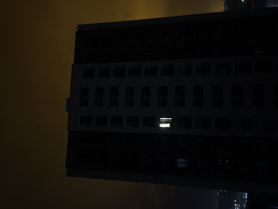A dimly lit, rectangular building looms against a dark, yellow-tinged sky. The structure has multiple floors with regularly spaced windows. Most are dark, except for a single, brightly lit window near the center. The lower section of the building fades into darkness, obscuring detail. Other buildings' lights are barely visible in the bottom right corner. The overall scene conveys a sense of solitude and mystery.