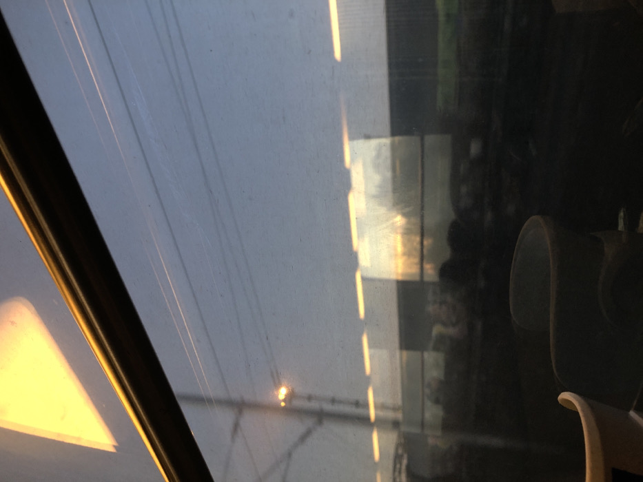 view from inside a train through a window. Outside, there is a structure with vertical white panels, reflecting a golden light, likely from the sun. There is a single street lamp outside. Inside the train, part of a seat and the window frame are visible, obscuring some of the view. There are faint reflections of power lines on the window surface.