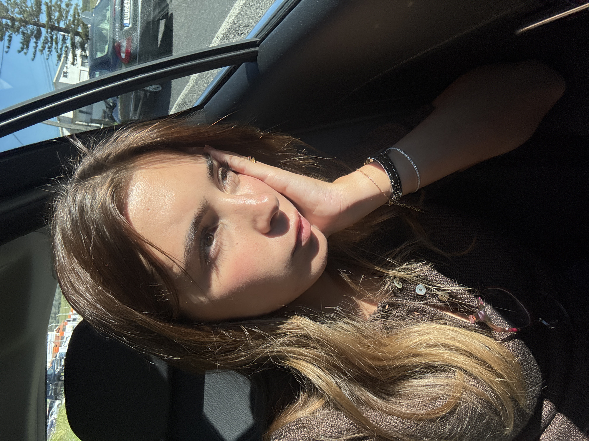 A young female is seated inside a vehicle, positioned in a passenger seat. She has long, light brown hair with blonde highlights and is wearing a dark brown knitted garment with visible buttons. Her left hand rests against her left cheek, with her fingers supporting her jawline. A gold ring is visible on her left ring finger, and her left wrist displays a watch with a dark link band, a delicate chain bracelet, and a silver-toned tennis bracelet. A pair of eyeglasses with pink frames hangs from her neckline. Direct sunlight illuminates the right side of her face, creating shadows on her nose and chin. Her gaze is directed towards the outside of the vehicle. Through the front windshield, several parked vehicles and a red and white structure are visible on a grassy incline. Through the side window, a dark sedan with a partially visible Portuguese license plate, reading "08-CZ-4X", is present on a paved road. White residential buildings and a tall conifer tree are discernible in the background under a clear blue sky. The scene is located in the city of Torres Vedras, Portugal.