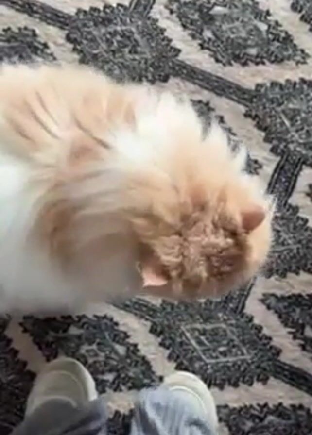 Here's a detailed description of the video: The video shows a person standing on a patterned rug, with a long-haired cat in front of them. The cat is mostly white, with peach or orange markings on its head. The person is wearing gray pants and white sneakers. The cat looks up at the person and meows, then looks down again. The rug has a gray and white geometric pattern. The cat’s fur looks soft and fluffy.