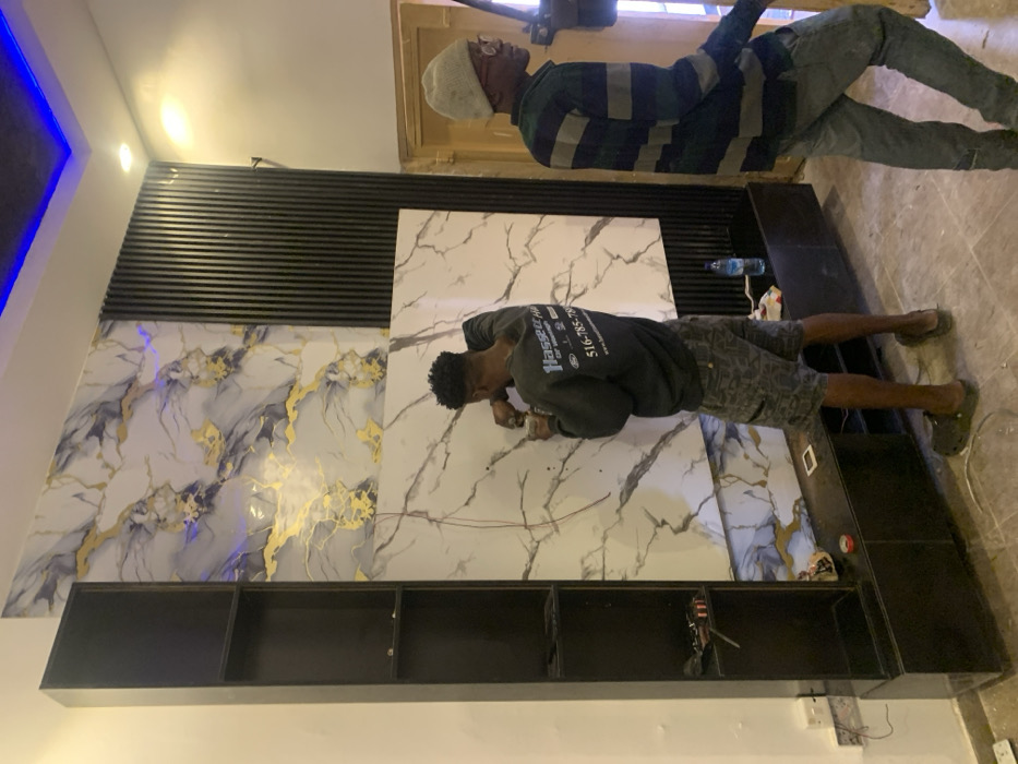 Within an interior room located in Gayawa, Nigeria, two adult males are present amidst ongoing construction or renovation activities. The room features a prominent wall unit composed of dark shelving on the left, a central section with a white and grey marble-effect panel, a dark and gold veined marble-effect panel, and a vertical black slatted panel. A dark low cabinet sits beneath the central panels. The ceiling is white with a blue LED strip light in a recess and a white spotlight. The floor is light-colored and tiled, with some visible dust and debris. The first male, positioned centrally, has short, dark, curly hair and wears a dark long-sleeved shirt with "Hasseer HR of Wappingers" and a phone number on the back, dark camouflage shorts, and dark slip-on sandals. He is actively engaged in electrical work, holding a tool and manipulating red and brown wires protruding from the white and grey marble-effect panel on the wall unit. A plastic water bottle with a blue cap and a small white object are visible on the low cabinet. The second male, located on the right, wears a light grey beanie, eyeglasses, a dark green and blue horizontally striped long-sleeved shirt, and light-colored pants. He is partially visible from the chest down, standing and facing towards the right side of the frame. A light wooden door is partially visible in the background on the right.