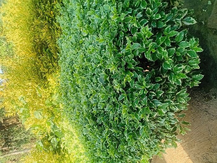two distinct types of foliage. The right side displays a lush bush with vibrant green leaves, each edged with a creamy white border. To the left, there's another bush or plant with leaves of a golden-yellow hue, creating a contrasting color palette. The leaves on both appear dense and full. The background includes a textured concrete surface, providing a neutral backdrop to the foliage.