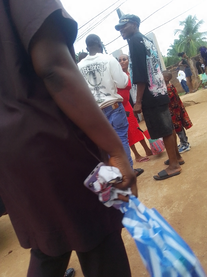 In Ukwu-Abwa, Nigeria, a street scene depicts several individuals. In the foreground, a person dressed in dark clothing holds a blue and white striped bag and a smartphone. Behind them, a man wears a white shirt with the word "Respect," jeans, and a brown belt. A woman in a red dress stands next to him. Another man in a black shirt and shorts is visible. A child in a patterned red and brown outfit stands nearby. Other individuals are present in the background. The ground is reddish-brown. Power lines are visible overhead.