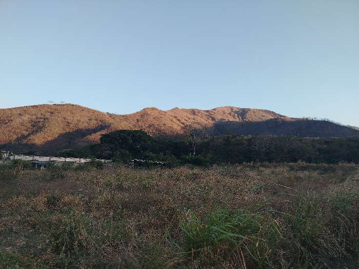 A landscape features rolling brown hills under a clear blue sky. A strip of darker green trees sits at the base of the hills. Below the trees, a field of dry grasses fills the foreground, with some patches of green. A gray structure resembling a bridge or building is faintly visible among the trees on the left. The scene is bathed in warm sunlight, casting shadows across the hills.