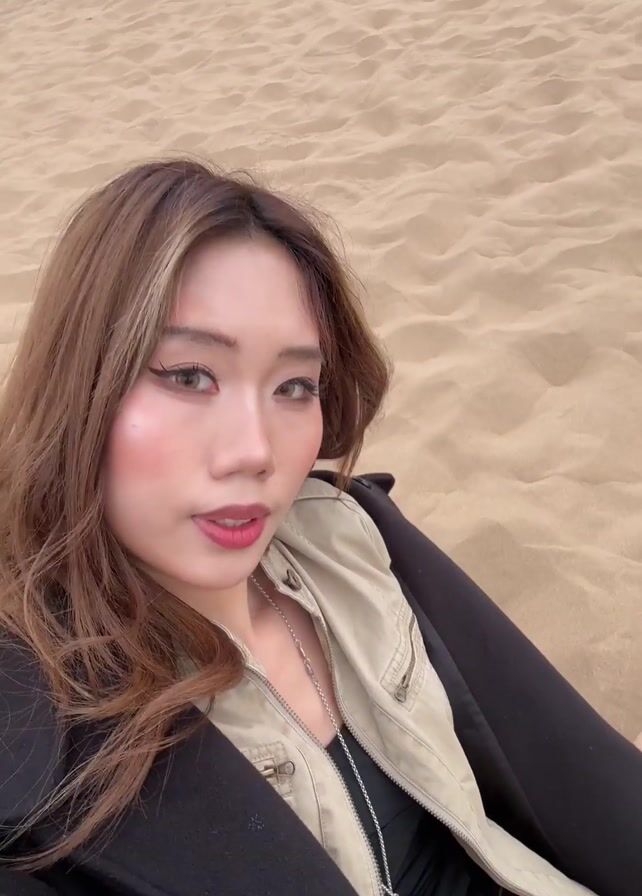 A young woman takes selfie videos in a sandy, crowded environment. She has long brown hair with a blonde streak and wears a black jacket over a beige jacket. A silver necklace is visible. In the background, other people can be seen walking and standing on the sand, and an off-road vehicle is present. The weather appears overcast. The woman poses for the camera, looking directly at it in most shots. Her nails are painted with a design featuring black and beige colors. The environment suggests a sand dune or beach setting.