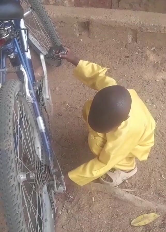 A child in a yellow outfit crouches next to a blue mountain bike with the rear wheel facing the camera. The child manipulates the chain and gears of the bike, apparently trying to fix it. The scene is outdoors on a dirt surface with a wall in the background.