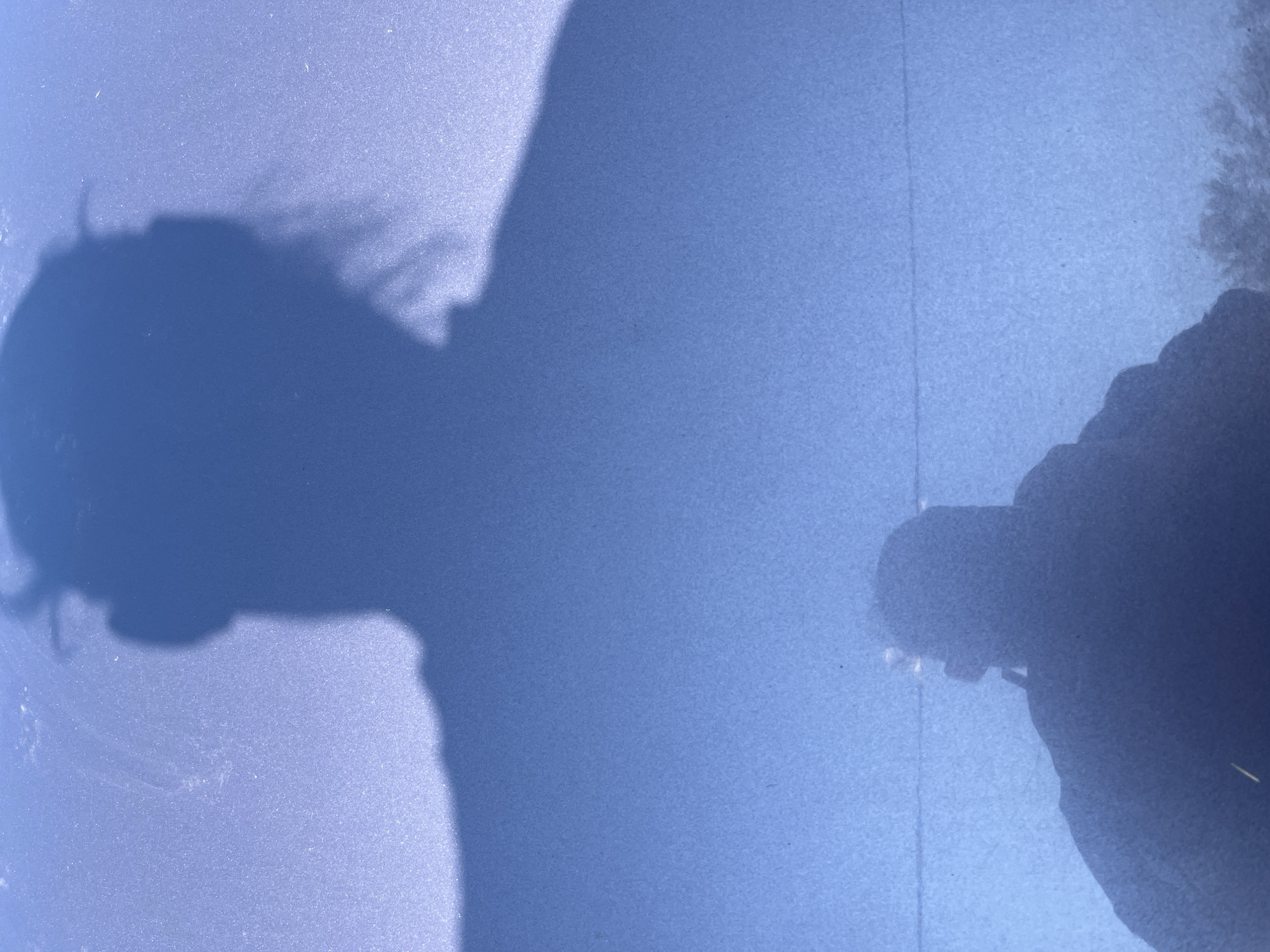 The image displays a forensic scene in Pchelnik, Bulgaria, centered on a light blue, granular surface consistent with a vehicle's painted exterior. A large, dark blue shadow of an individual, facing forward with a discernible head, shoulders, and apparent headphones or a headset, occupies the upper two-thirds of the frame. Below and centered in the lower third is a smaller, darker blue, inverted reflection or shadow of a second individual, also facing forward, possibly holding a device, consistent with the photographer's self-reflection. The immediate background surface exhibits scattered dust particles and subtle linear imperfections. In the bottom right of the reflected area, indistinct dark shapes resembling tree foliage are visible, indicating an outdoor setting. A faint, dark horizontal line extends across the mid-ground above the lower reflection.