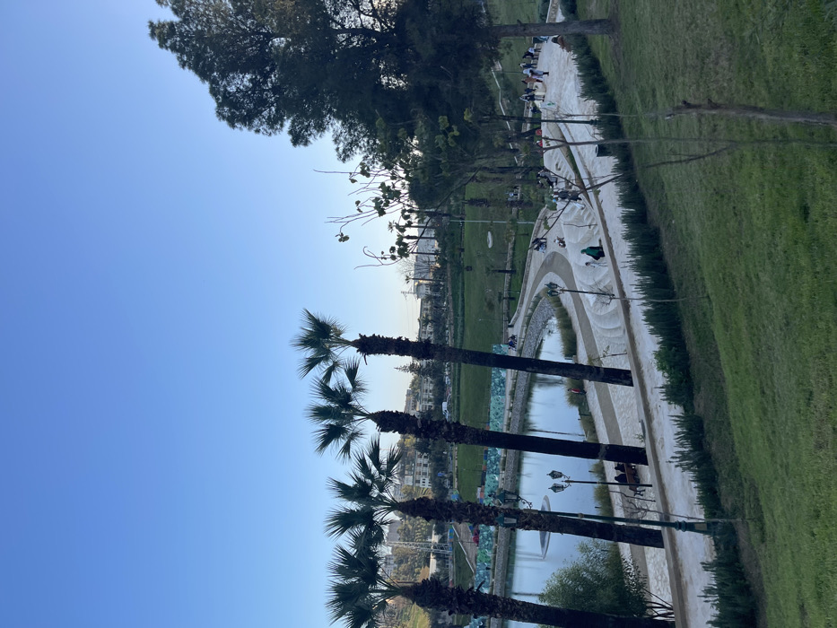 A park view features four palm trees lining a waterway. A white pathway borders the water, with people seated along its edge. A grassy expanse and more trees stretch to the right. In the distance, buildings are visible under a bright sky. Larger trees stand to the left.