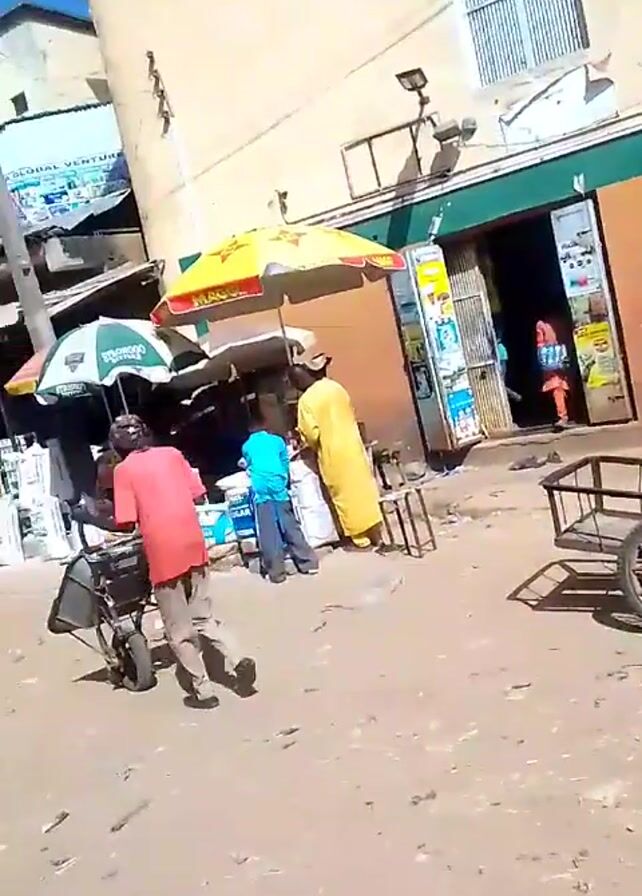bustling street scene in what appears to be a market area during daylight. The ground is dirt, and the buildings seem to be two or three stories tall. There are several vendors present, sheltered by colorful umbrellas. A man in a red shirt walks by pulling a wheeled cart. A black minivan with a roof rack is parked near a tall stack of boxes labeled "Kim." The overall scene is busy and reflects common street life in an urban market setting.