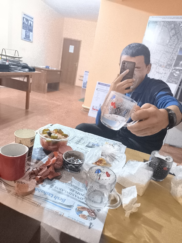 The image depicts an indoor scene in the city of Pakhtakor, Uzbekistan, likely an office or breakroom, with a light wooden table covered by a newspaper in the foreground. A male individual, positioned behind the table, faces the camera. He is wearing a dark blue long-sleeved shirt and has short, dark hair. His right hand holds a black smartphone to his face, partially obscuring it, while his left hand extends a clear glass mug with a red and blue mushroom design towards the viewer. The mug contains a clear liquid with white particulate matter. A black watch is visible on his left wrist. The table features various items: a red ceramic mug and a patterned paper cup on the left. In the center, a clear plastic container with a green lid holds a salad of chopped vegetables (cucumbers, tomatoes, and other items). Nearby, a small dark bowl contains ash and cigarette butts. A pile of reddish, irregularly shaped food items (possibly fried snacks) is also present. To the right, an empty clear glass mug with a similar mushroom design, a dark glass with white polka dots containing a dark liquid, and several small white paper packets or plastic bags containing a white granular substance (likely sugar) are arranged. Remnants of food are visible in a clear plastic bag. The background shows light orange walls and a light brown floor. To the left, a wooden desk with a metal paper tray and documents is visible. A closed wooden door with a small white panel is centered in the background. On the walls, framed documents or certificates are displayed to the left, and a large poster featuring what appears to be an aerial or architectural map is visible to the right.
