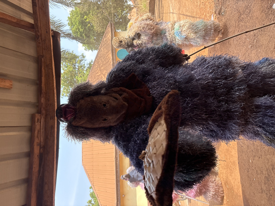 A daylight scene in Oturkpo, Nigeria, depicts multiple costumed figures on reddish-brown earth. A prominent figure, centrally positioned, wears an elaborate dark blue and grey shaggy costume covering the entire body. The costume features a brown, plush head with two eye apertures, topped by a dark, open-mouthed mask, possibly avian or reptilian, revealing red interior details. A brown fabric scarf is draped around the neck. The figure's left arm extends forward, holding a flat, dark brown, circular object with a textured, woven surface and a plush rim. A slender, dark staff is held in the figure's right hand. To the immediate left, a partially obscured figure in a pink-hued shaggy costume is visible. To the right, another individual wears a light-colored, shaggy costume with pastel accents, alongside a figure featuring a leopard-print headpiece. The background contains structures with reddish-brown corrugated metal roofs and green trees against a clear blue sky. The upper frame reveals the underside of a light-colored corrugated metal roof supported by wooden beams.