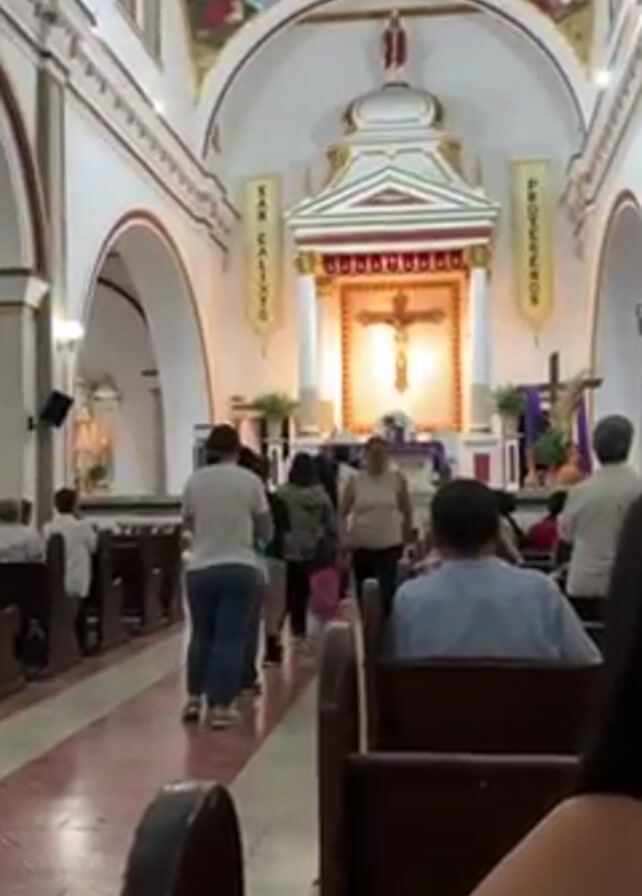 Inside a church, a line of people moves down the aisle toward the altar. The church has a white ceiling and white walls with archways and paintings. Banners that read “SAN CALIXTO” and “PROTEGENOS” hang on either side of the altar, which features a large gold crucifix. Pews line both sides of the aisle, and some people are sitting in them. Most of the people in the line are adults, though one young child wearing a pink shirt and white pants walks hand-in-hand with an adult woman. The floor is patterned with red and white designs. The camera is positioned at a slight angle from one of the pews.