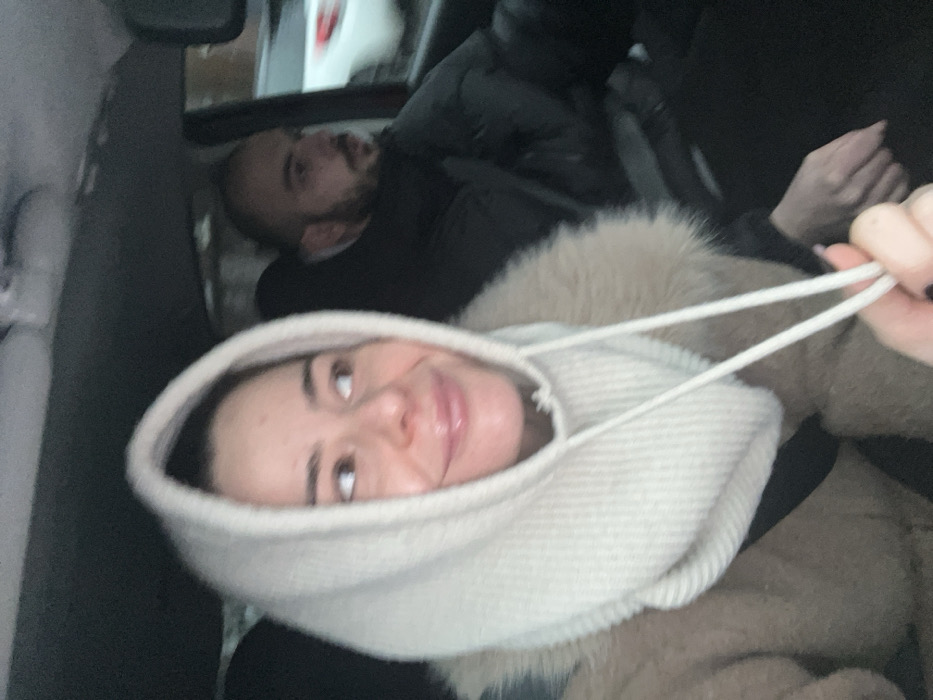 The image captures two individuals inside a vehicle in motion within the city of Roubaix, France. In the foreground, a female subject is seated, wearing a cream-colored ribbed knit balaclava-style hood over dark hair and a light brown coat, possibly with faux fur trim. She exhibits a slight smile and her gaze is directed towards her right. Her right hand is visible, holding the drawstrings of the balaclava, with fingernails painted dark. Behind her, partially visible in the driver's seat, is a male subject with a shaved head and a beard, wearing a dark puffer jacket. He is looking forward. The vehicle's interior features dark grey overhead lining and dark plastic components. Through the windows, a blurred exterior environment is visible, indicating movement, with a white vehicle partially discernible through the driver's side window. The overall lighting is subdued.