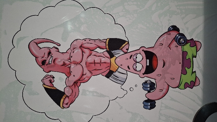 A cartoonish illustration features Majin Buu from Dragon Ball Z with a muscular physique. He's within a cloud thought bubble. Next to him is Patrick Star from Spongebob Squarepants, depicted as a bodybuilder lifting dumbbells. Patrick has a determined expression. The art combines elements from both franchises in a humorous way.