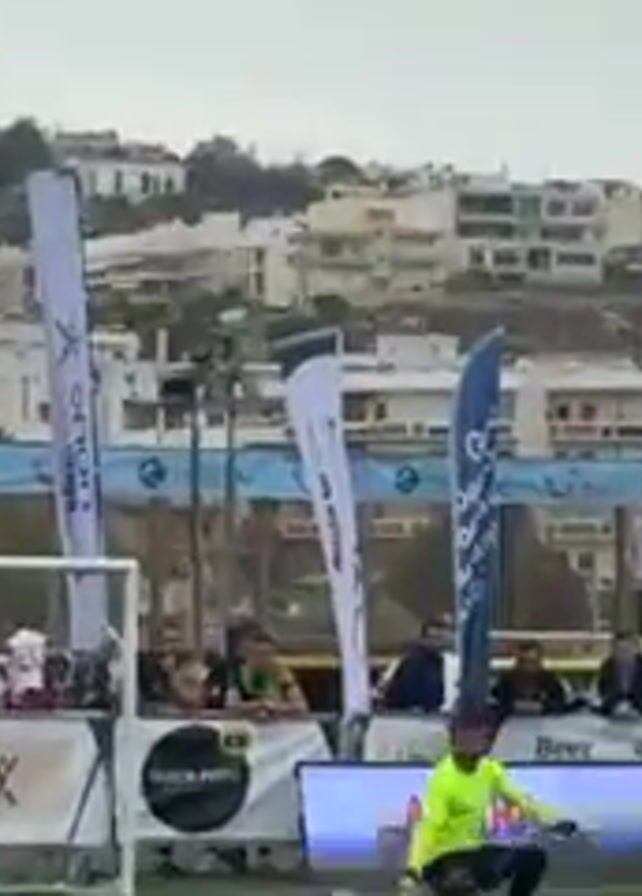 A soccer game is in progress on a green field, with a player in a pink uniform taking a penalty kick against a goalie wearing bright yellow. The goalie attempts to block the kick but is unsuccessful, and the player in pink scores. Spectators can be seen behind the goal, with a backdrop of buildings on a hillside and flags advertising various brands.