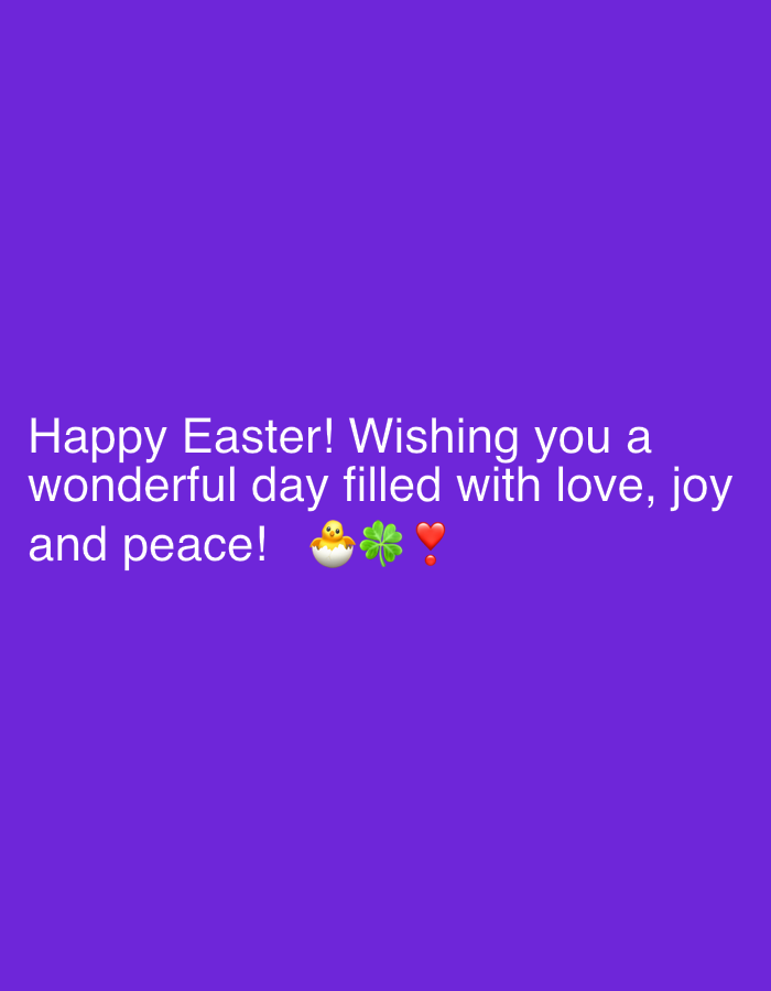 This image is a purple background with the text "Happy Easter! Wishing you a wonderful day filled with love, joy, and peace!" followed by emojis of a chick, a four-leaf clover, and a heart