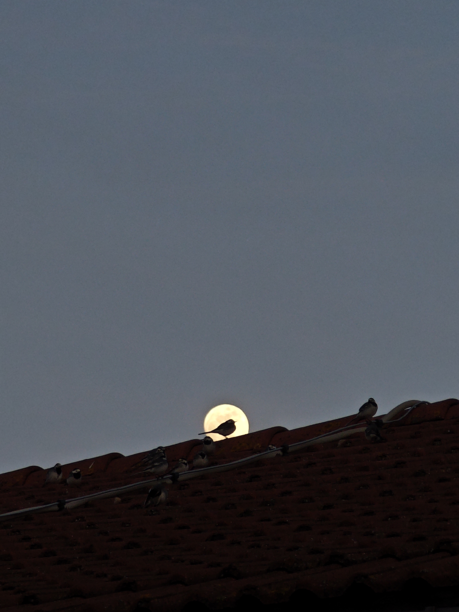 night scene in Kichevo, Bulgaria. A group of birds, likely White Wagtails, are perched on the tiled roof of a building. Behind the roof, a full moon is visible in the night sky. The sky is a dark, muted color. The tile roof appears to be orange or red, and is textured. A white electrical conduit or pipe runs along the roofline. The image is taken at an angle, looking up at the roof and sky. The scene is dimly lit.