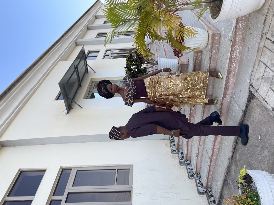 A couple is standing on steps in front of a building. The woman wears a brown top with leafy accents, a gold skirt, and a headdress. The man wears a brown suit with a striped cap. Potted plants and flowers are on the steps. The building is white with visible windows and a slanted roof. The sky is blue.